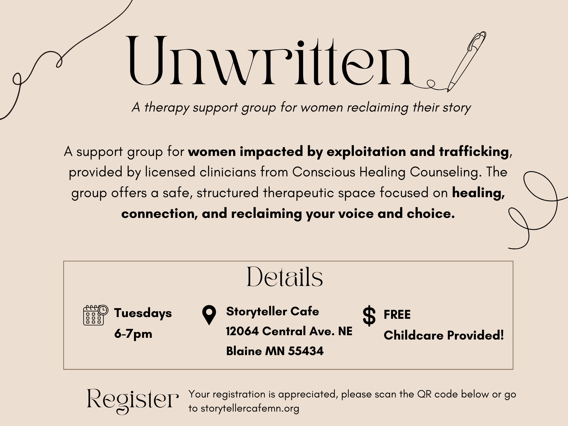 Join us on Tuesdays from 6-7PM at Storyteller Cafe for a support group for women impacted by exploitation and human trafficking. This is a free support group and free child care is provided.